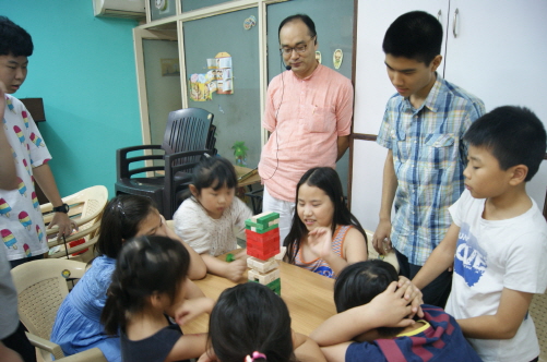 어린인 전도초청 예배를 위해 중고등부 형들이 동생을 위해 게임을 진행하고